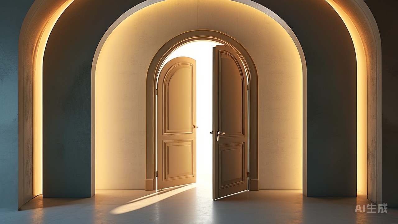 门厅深处,视线被空间温柔地引向深处。两侧墙面以最简洁的弧线悄然内收,如同自然形成一道光的走廊。脚步不自觉被这无形的力量牵引,前方门扉也呼应似的,呈现出微妙的拱形轮廓,俨然一道通往另一重境界的隐喻之门。每一处弧度的细微转折,都为行走注入了韵律般的庄重感,仿佛每一步都落在无形的礼序之上。