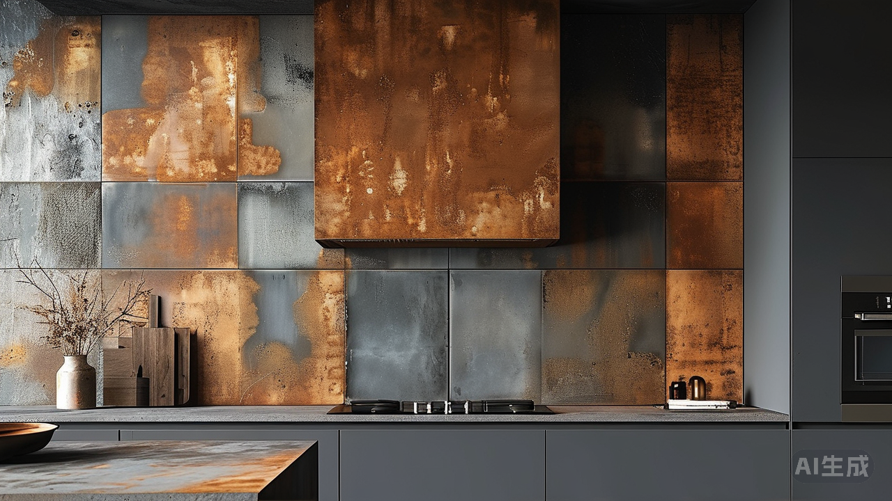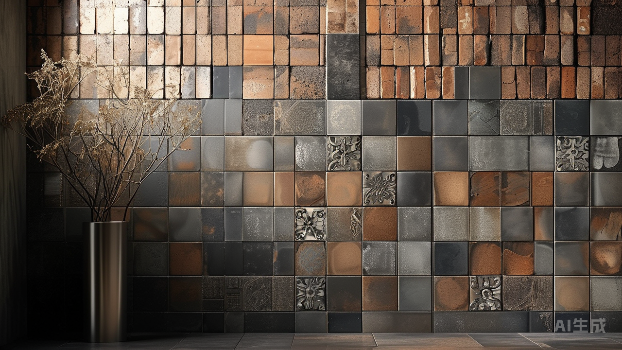 仿古砖,是时间凝固的默片。它斑驳的釉面、磨损的边缘、沉郁的灰调或砖红,无声讲述着岁月刻下的痕迹。当它们大面积铺陈于地面或局部覆盖墙壁,一种工业遗迹般的沧桑感与历史重量便扑面而来。它们摒弃了精致陶瓷的浮华,以粗犷的颗粒感与不完美的纹理,奠定空间原始而真实的基调,仿佛老厂房经年累月的地面,承载着机器轰鸣的旧梦。 金属花砖,则是空间乐章中一记惊心动魄的强音。当冰冷的铁灰、古铜或带有锈蚀质感的金属釉面瓷砖闯入视野,它们即刻成为视觉风暴的中心。它们或点缀于质朴的仿古砖背景墙上,如一枚粗犷的金属勋章;或铺陈于厨房防溅墙,让烹饪空间弥漫着精工车间的冷峻气息;甚至化身地面焦点,踏足其上,足底仿佛能感受到金属的硬度与能量。其冷峻的光泽、几何化的工业图案与粗犷的肌理,在粗糙砖石的衬托下迸发出强烈的现代机械美学,在沉稳中点燃一簇冰冷的火焰。