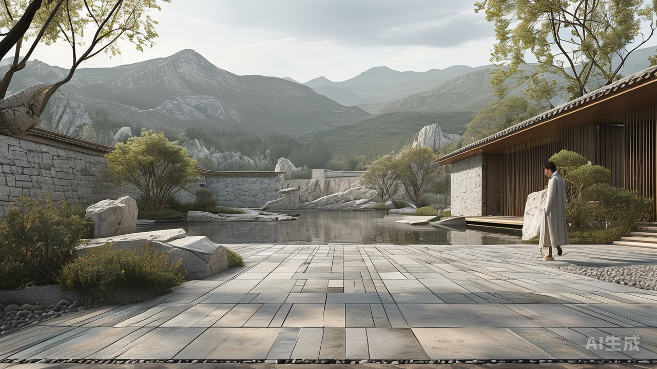 新中式深谙“隔而未隔,界而未界”的分寸之妙。仿石瓷砖的纹理走向,便是空间流动的无声指引。地面之上,那些宛若天然形成的石纹脉络,或如远山连绵,或如流泉蜿蜒,以其内在的生命律动,温柔牵引着视线向庭院深处延展。立于室内,目光沿着这石韵铺就的“流径”,便能轻易穿透轩窗门扉,捕捉到庭院角落里那丛芭蕉的绿意,感受到阶前被雨水打湿的青苔所散发的微凉气息。内外之景,在石纹的巧妙引导下,达成了气韵的互渗与共鸣。 更有甚者,是瓷砖表面那精心摹写的天然肌理——微妙的凹凸、粗粝的颗粒感,甚至阳光投下的浅淡痕迹——皆非冰冷之物。指尖拂过,足底感知,唤起的是对山野石径、河畔卵石最直接的联想。这一方方仿石铺地,便成了室内承载自然意象的基石,让庭院中那方天地里的风骨、清寂与时间沉淀的沧桑感,得以无声沁入室内的每一个角落,呼吸间皆是天地灵息。