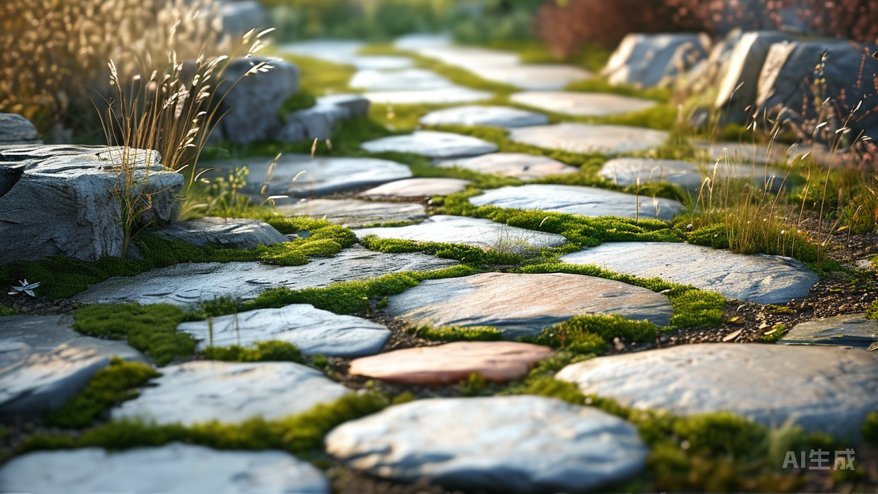 铺路之时,更须放却匠气。石板并非棋子般排布,倒像信步游走于野径之上,自然而然地落脚——或疏或密,或大石沉稳如磐,或小石点缀其间。石板与石板之间,务必留出宽窄不等的缝隙,如同大地温柔的呼吸孔穴。这缝隙并非虚空,而是未来生机的预留之地。泥土露出来,便为绿意预留了通道,日后青苔自会悄然攀附,细小的草籽亦将悄然萌发,柔弱却坚韧地探首于石隙之间。待时日推移,石面也会染上岁月的沧桑,苔痕斑驳,水渍浸润,留下光阴温柔踩踏的印记,愈发显出与花园血肉相融的亲密。